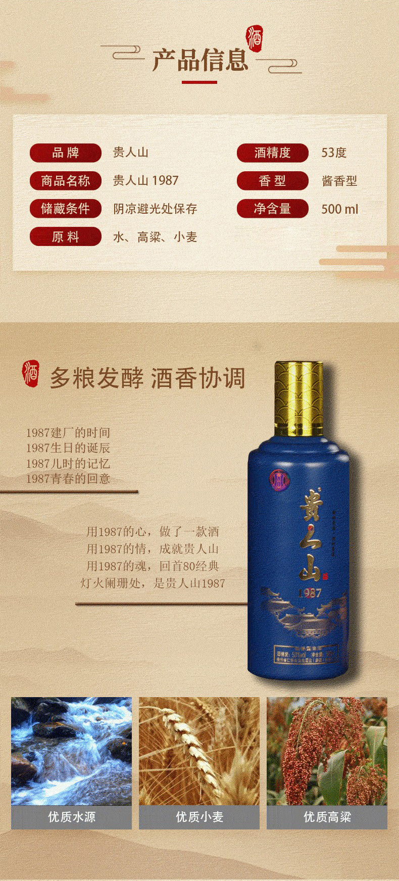 贵人山53度贵人山1987 白酒 酱香型纯粮食酒 500ml单瓶装高度白酒礼盒 53度 500mL 1瓶 美人泪